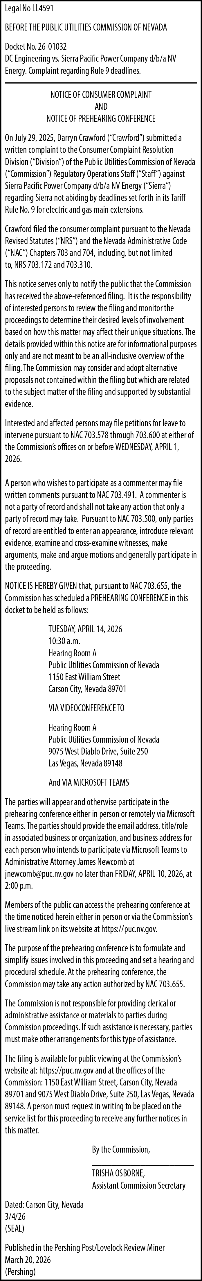 BEFORE THE PUBLIC UTILITIES COMMISSION OF NEVADA : NOTICE OF JOINT APPLICATION AND PREHEARING CONFERENCE